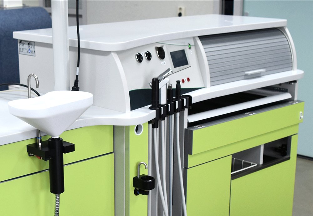 ○ Possibilité d’intégrer un bac pour instruments usagés, une poubelle ou un évier.